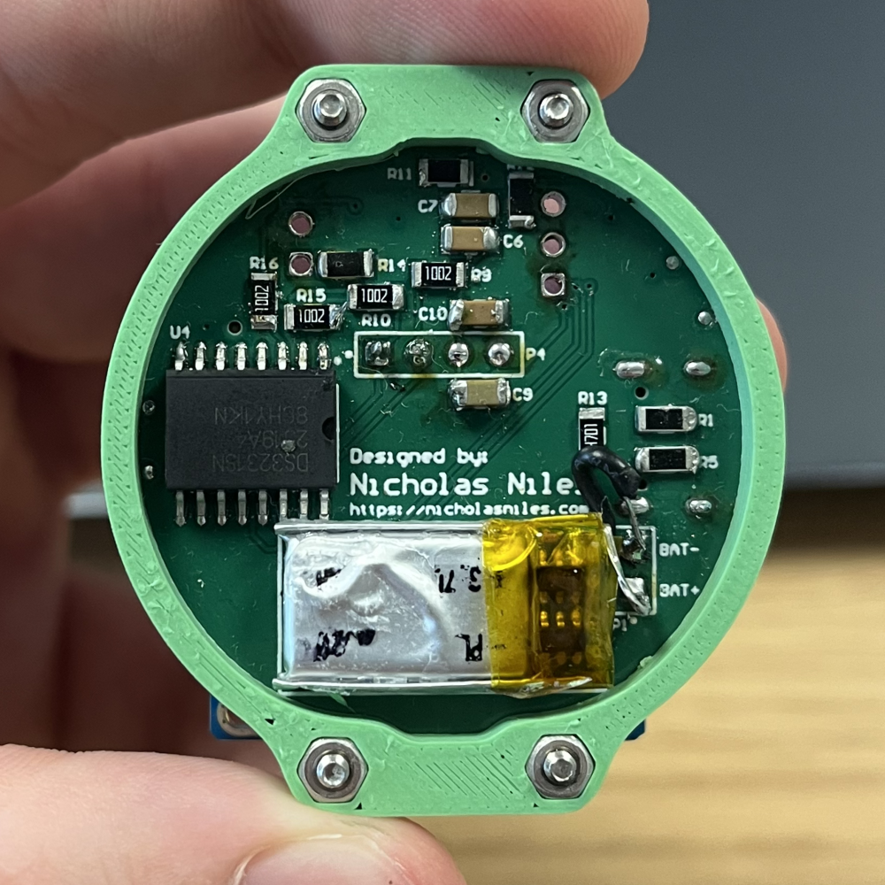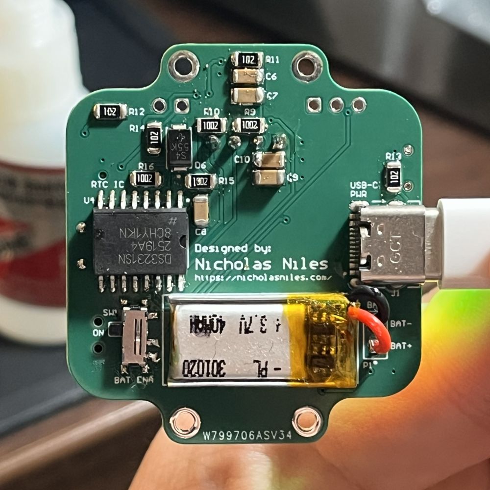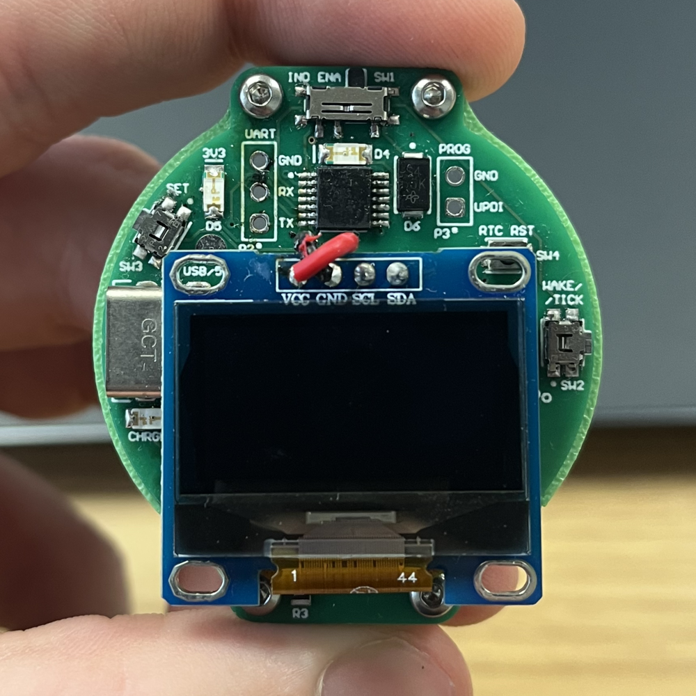 This device has been by far my most difficult project to date. To begin, the biggest challenge was to find the proper microcontroller capable of the job. This went beyond just pinout count or other simple metrics. To run an OLED display, many large libraries need to be loaded onto the MCU, and as such, flash and memory were a big challenge in picking the microcontroller. I originally looked at using an ATMega328PB as my MCU, but decided against it as I much prefer the UPDI method of programming over SPI. As such, I knew I wanted an ATtiny series MCU, but all the ones I had used previously were not capable of storing those libraries. After some research, I came across the ATtiny3224 MCU, a 32kb flash MCU capable of storing all my program data and having well enough pins for the job, while also still being UPDI programmable. The next big challenge for me was combining all of the different systems, LiPo BMS, MCU, OLED, RTC IC, into one board, and also into a footprint small enough to fit on a normal-sized watch face. I was able to conquer this challenge but it took a lot of extra and detailed planning and layout work for the PCB design. Finally, I'd say the RTC IC was a challenge. It worked first try on the first manufactured prototype, but I definitely had a lot of worries with my schematic work revolving around the IC, afraid I might have missed something and that it wouldn't work. But, as mentioned, it worked first try, and that was largely in part to me reading the datasheet thoroughly.