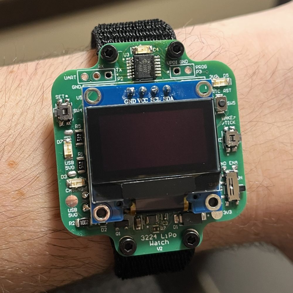 The 3224 LiPo Watch is an ATtiny3224 microcontroller-controlled device that uses a RTC IC in combination with an OLED display to show the current time of day when woken. The device runs off a 40mAh LiPo rechargeable via USB-C. It is a culmination of my MCU Dev Boards, LiPo BMS, and experience with OLED displays, all in one large embedded project.